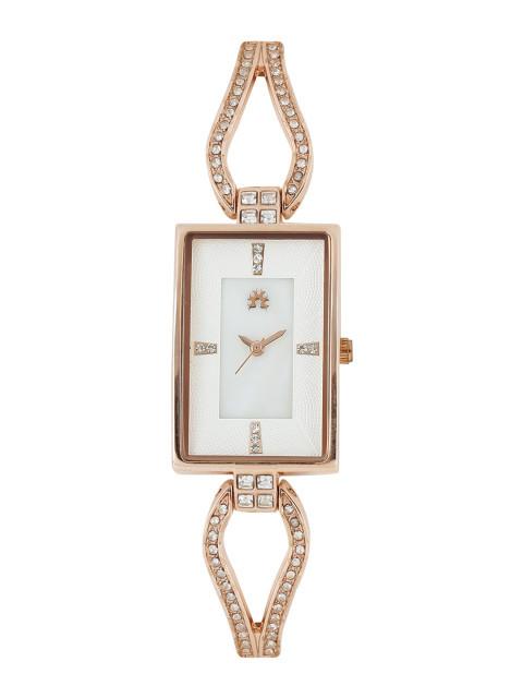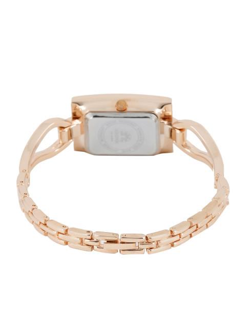 Simple watch with a rectangular case and a stainless steel back. Silvery white dial. A screw to reset the time.Rose gold-toned decorated wrist trinket style strap, secured with an overlap over fasten Water-safe.