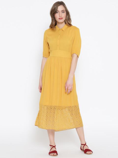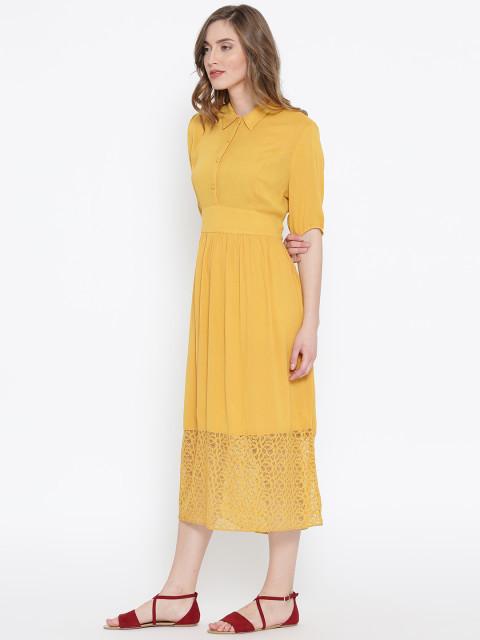 Mustard yellow strong woven midi shirt dress with trim detail, has a shirt neckline, short catch placket, short sleeves, somewhat flared fix.