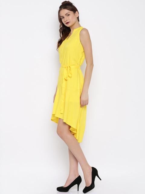 Yellow strong woven shirt dress with a tie-up itemizing, has a mandarin neckline, sleeveless, high-low hem.Comes with a nightgown.